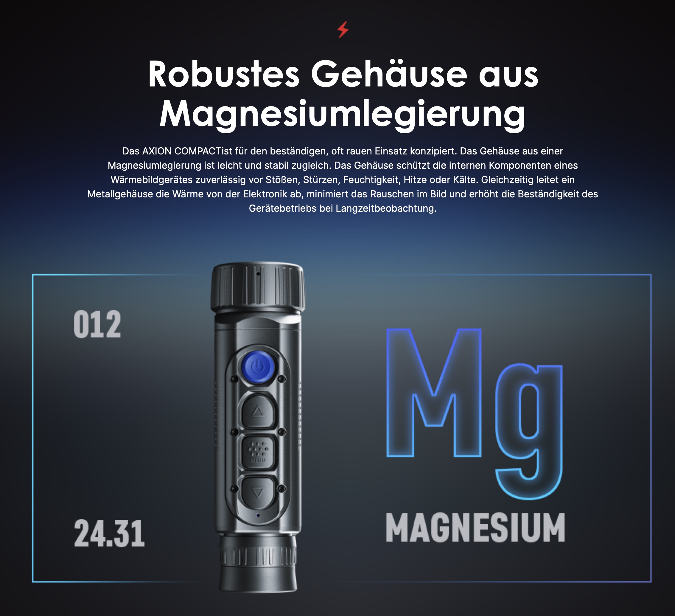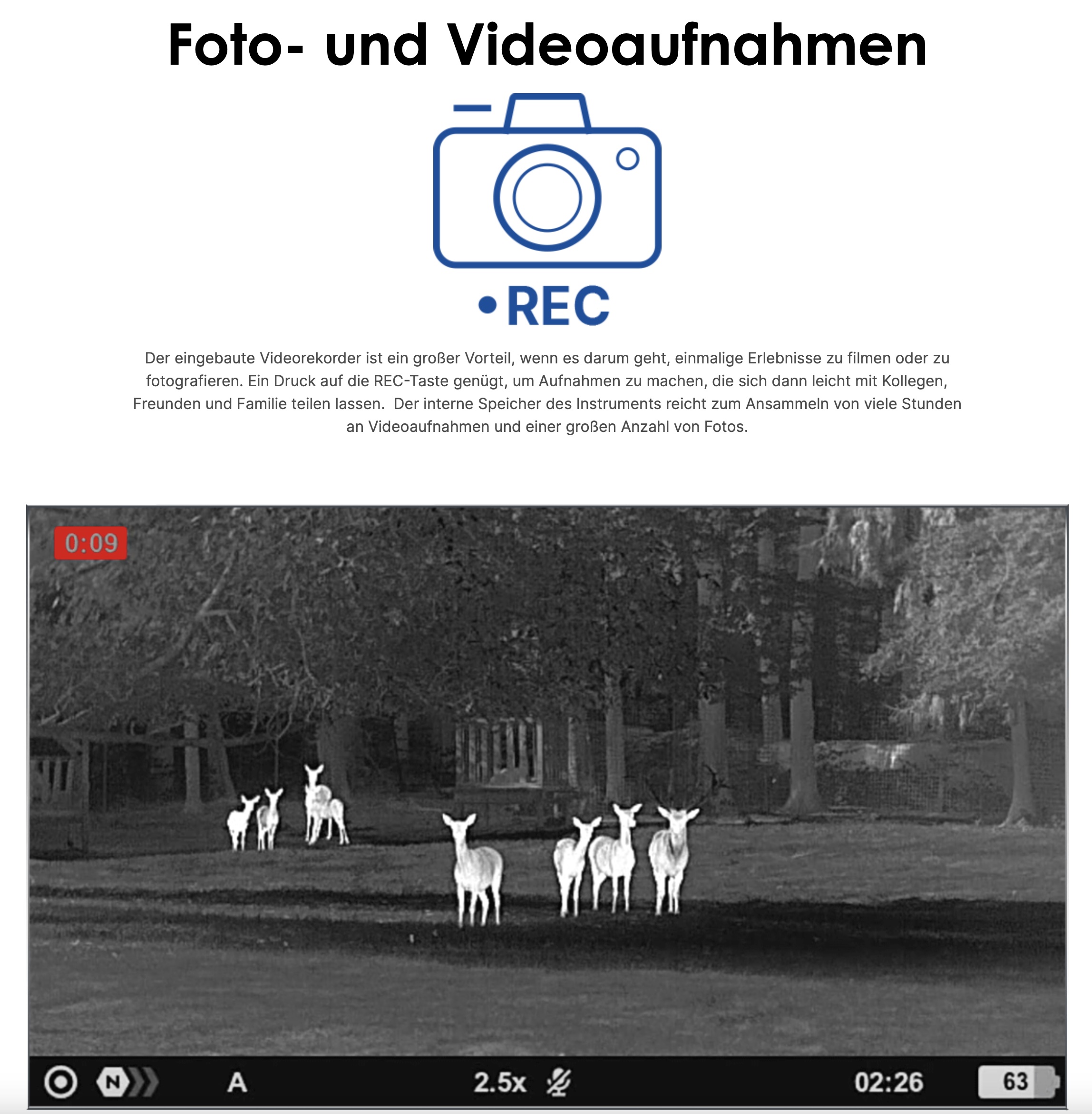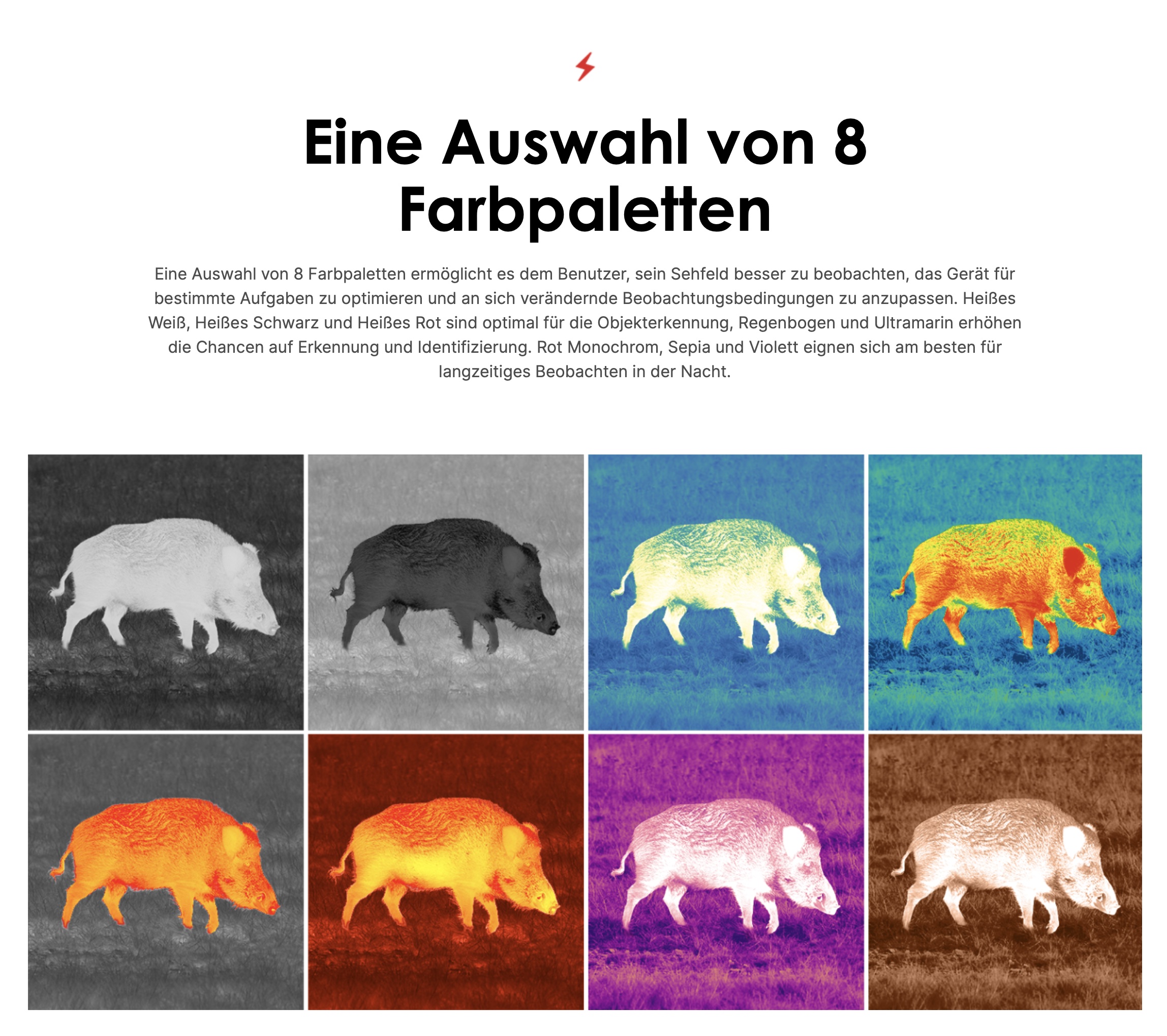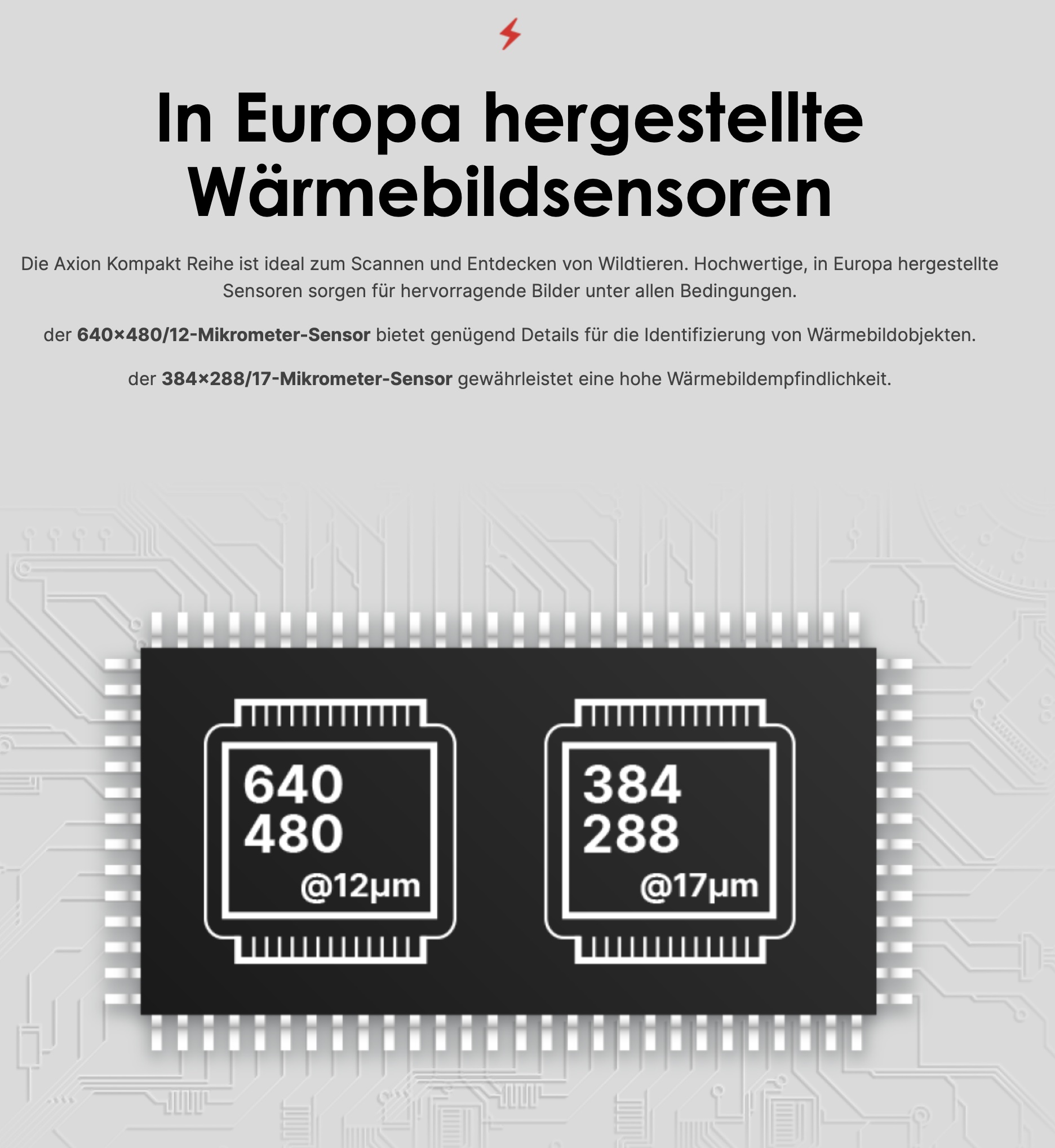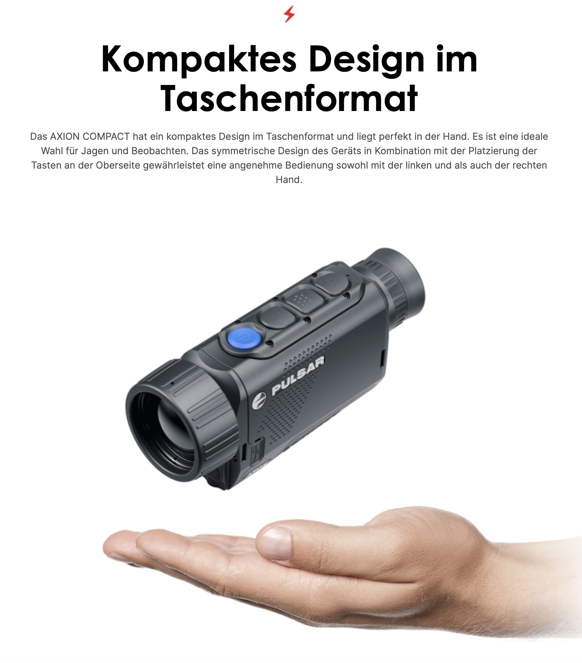 PULSAR Wärmebildgerät Axion 2 XQ30 Pro 384x288 Pixel @ 17 µm NETD <25 mKArtikelnummer: 77506EAN: 4779022926068Verbesserte Algorithmen zur BildverarbeitungRobustes Gehäuse aus MagnesiumlegierungHochempfindlicher Lynred-Sensor mit 384x288 Pixeln @ 17 µm NETD <25 mKObjektiv F30/1.2 mit großer BlendenöffnungLange Akkulaufzeit: bis zu 7 Stunden Dauerbetrieb mit einer AkkuladungWasserdicht gemäß IPX7Eingebauter Foto- und Videorekorder mit 16 GB internem SpeicherKontrastreicher AMOLED-BildschirmVerbesserte Algorithmen zur BildverarbeitungDie Axion 2 XQ-Wärmebildgeräte verwenden einen neuen Ansatz zur Bildoptimierung, der je nach Zweck und Bedingungen der Beobachtung eine qualitativ hochwertige Wiedergabe von Zielobjekten und Hintergrund liefert. Drei Stufen der Signalverstärkung in Kombination mit einem verbundenen Glättungsfilter und fein abstimmbaren Helligkeits- und Kontrasteinstellungen bieten dem Jäger großartige Möglichkeiten, das Tier unter verschiedenen Wetter- und Temperaturbedingungen auf weite Entfernung zu entdecken und seine Trophäenqualität zu bestimmen.Robustes Gehäuse aus MagnesiumlegierungDas Axion ist für den ständigen, oft harten Einsatz konzipiert. Das Gehäuse aus einer Magnesiumlegierung ist zugleich leicht und robust. Es schützt die internen Komponenten des Wärmebildgerätes zuverlässig gegen Erschütterung, Herunterfallen, Feuchtigkeit, Hitze oder Kälte. Gleichzeitig leitet das Metallgehäuse die Wärme von der Elektronik ab, minimiert das Bildrauschen und erhöht die Betriebsstabilität des Geräts bei Langzeitbeobachtungen.Hochempfindlicher Lynred-Sensor mit 384x288 PixelnDas Axion 2 XQ30 Pro ist mit einem europäischen Lynred-Sensor mit einer Auflösung von 384x288 Pixeln (Pixelgröße 17 Mikrometer) ausgestattet, der auch unter schwierigen Beobachtungsbedingungen wie Regen, Nebel und hoher Luftfeuchtigkeit am Beobachtungsort ein brauchbares Signal aufnimmt.Objektiv F30/1.2 mit großer BlendenöffnungDas Germanium-Objektiv F30/1.2 bietet eine hohe Transmission im langwelligen Infrarot-(LWIR)-Bereich. Dank der hochpräzisen Fertigung der optischen Elemente des Objektivs zeichnet sich das vom Sensor des Wärmebildgeräts Axion 2 XQ30 Pro erzeugte Bild durch seine Klarheit und Detailgenauigkeit aus.Lange Akkulaufzeit: bis zu 7 Stunden Dauerbetrieb mit einer AkkuladungEin wiederaufladbarer APS5-Akku mit hoher Kapazität ermöglicht den Dauerbetrieb des Wärmebildgeräts über bis zu 7 Stunden mit einer einzigen Ladung. Er kann in Sekundenschnelle aus dem Akkugehäuse entfernt und durch einen neuen ersetzt werden. Der Akku wird in einem speziellen Gerät oder innerhalb des Wärmebildgeräts mit einem PC, einem Netzstecker oder einer Powerbank über USB-C aufgeladen. Die gleichen Quellen werden für die externe Stromversorgung des Wärmebildgeräts verwendet.Verbesserte Wi-Fi-Konnektivität mit Unterstützung der 2.4- / 5-GHz-WellenbereicheBei den Axion 2 XQ-Wärmebildkameras wird der Frequenzbereich der Standard-Smartphone-Verbindung über einen 2,4-GHz-WiFi-Kanal durch einen effektiven 5-GHz-Bereich ergänzt. Die 5-GHz-Verbindung bietet eine bessere Bandbreite, eine schnellere Datenübertragungsrate, Rauschunempfindlichkeit und eine verbesserte Stabilität der Verbindung, was zu einem produktiveren und einfacheren Betrieb der Wärmebildkamera mit einem Smartphone führt.850 m ErkennungsreichweiteDas F30/1,2-Objektiv bietet in Kombination mit dem hochempfindlichen 384x288@17 µm Wärmebildsensor außergewöhnliche Aufnahmemöglichkeiten. Ein Standardobjekt von 1,8 m Höhe kann in völliger Dunkelheit in einer Entfernung von bis zu 850 m erkannt werden.Sehfeld von über 13,3 GradDas Axion XQ30 Pro verfügt über ein Sehfeld von 13,3°, das das Scannen und die Suche nach warmen Objekten vereinfacht. Das große Sehfeld ermöglicht es dem Beobachter, schnell alle warmen Objekte zu erkennen und sich auf die interessantesten zu konzentrieren, während er gleichzeitig die gesamte Szene im Auge behält.Taschengerechte Größe und geringes GewichtDas Axion 2 XQ30 Pro hat ein platzsparendes Design im Taschenformat und wiegt nur 300 Gramm. Durch das symmetrische Design und die Anordnung der Tasten auf der Oberseite ist das Gerät sowohl für Rechts- als auch für Linkshänder leicht zu halten und zu bedienen.Variable Vergrößerung von 2-fach bis 8-fachDer bis zu 4-fache Digitalzoom sorgt für verbesserte Schärfe und ermöglicht die einfachere Erkennung von Objekten in großen Entfernungen. Der Zoom lässt sich entweder stufenweise in 2x-Schritten oder kontinuierlich einstellen für ein wirklich optimales, auf die jeweilige Situation zugeschnittenes Sehfeld.Schnelle InbetriebnahmeDas Axion 2 XQ30 Pro zeichnet sich durch eine kurze Einschaltzeit aus: Nach dem Drücken der EIN-Taste ist das Gerät innerhalb von 5 Sekunden voll funktionsfähig. Die Schnellstartfunktion hilft, Strom zu sparen: Damit muss das Axion 2 XQ30 Pro bei der Jagd nicht ständig eingeschaltet sein, sondern lässt sich bei Bedarf schnell starten.Wasserdicht gemäß IPX7Wasserdicht gemäß IPX7 zum Schutz vor starkem Regen, Schnee oder anderen Feuchtigkeitseinflüssen. Das Gerät ist so konstruiert, dass es auch dann noch einwandfrei funktioniert, wenn es bis zu 30 Minuten lang in bis zu 1 Meter tief in Wasser getaucht ist.Eingebauter Foto- und Videorekorder mit internem 16 GB SpeicherDer eingebaute Videorekorder ist ein großer Vorteil, wenn es darum geht, einmalige Erlebnisse zu filmen oder zu fotografieren. Einmal auf die REC-Taste drücken genügt, um Aufnahmen zu machen, die sich problemlos mit Kollegen, Freunden und Familie teilen lassen. Der interne 16 GB große Speicher reicht aus um viele Stunden Videoaufzeichnungen und eine riesige Anzahl an Fotos zu speichern.Kontrastreicher AMOLED-BildschirmDer kontrastreiche AMOLED-Bildschirm mit VGA-Auflösung hat eine verbesserte Farbwiedergabe, ist stromsparend und reaktionsschnell und liefert auch bei Frost scharfe und flüssige Bilder.Fern