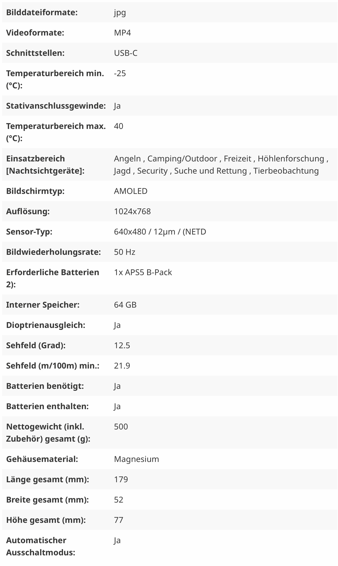 Pulsar 77465 Wärmebildfernglas Merger LRF XP50Das LRF-Wärmebildfernglas von Merger ist in dem klassischen Design eines Tageslichtfernglases gehalten. Mit seinem kleinen Formfaktor liegt dieses Wärmebild-Fernglas bequem in der Hand, bietet aber dennoch eine ansprechende äußere Ästhetik und eine vorbildliche Ergonomie. Die sechs Funktionstasten liegen in der bequemen Zugriffszone und die am häufigsten verwendeten digitalen Gerätefunktionen lassen sich mit einer einzigen Berührung aktivieren. Bequemes SeherlebnisDas optische Design des Merger LRF-Fernglases ist ganz auf die Natur des menschlichen Sehens abgestimmt. Natürlicherweise nimmt ein Mensch die Informationen vom Sehen über zwei visuelle Kanäle gleichzeitig auf. Das Sehen mit zwei Augen ist weniger ermüdend als das Sehen mit einem Auge. Das bedeutet eine bessere Erkennung von kleinen oder schwachen Objekten und eine bessere Leistung in kontrastarmen Szenarien als bei vergleichbaren monokularen Wärmebildgeräten mit demselben technischen Niveau. Der Augenabstand des Merger LRF-Fernglases ist von 56 bis 71 mm einstellbar, um ihn individuell an die Bedürfnisse des jeweiligen Benutzers anzupassen. Eingebauter Präzisions-LaserentfernungsmesserUm die richtigen Entscheidungen zu treffen, ist es wichtig, die Entfernung des Ziels genau einzuschätzen. Ein eingebauter Laser-Entfernungsmesser mit einer Reichweite von bis zu 1 Kilometer lässt Sie die Entfernung in den Modi Einzelmessung und kontinuierliche Abtastung mit einer Genauigkeit von ± 1 Meter messen und ermöglicht Ihnen somit eine schnelle und fehlerfreie Einschätzung der Situation. Hochauflösende Wärmebildkamera mit 640x480 Pixel @ < 25 mK NETD SensorBeim Beobachten unter Bedingungen mit geringstem Temperaturkontrast sowie bei Regen oder Nebel erfasst ein hochempfindlicher Sensor mit < 25 mK NETD auch nur ganz geringe Temperaturunterschiede. Die Auflösung von 640x480 Pixeln sorgt für eine zuverlässige Identifizierung des Ziels, eine hochwertige Visualisierung wichtiger anatomischer Merkmale des Tieres und winzige Details der umgebenden Landschaft. Lichtstarkes Objektiv F50/1.0Die Eigenschaften der Wärmebildoptik haben einen entscheidenden Einfluss auf die Fähigkeit eines Wärmebildgerätes, Wärmestrahlung mit niedrigstem Strahlungspegel zu erfassen. In Kombination mit hochempfindlichen Sensoren bieten die lichtstarken Objektive der Wärmebildgeräte Merger LRF (F50/1.0) die höchste Entdeckungseffizienz. Bei Regen oder Nebel, wenn der Temperaturkontrast der beobachteten Objekte minimal ist, steht dem Benutzer vom Merger LRF immer ein höchst qualitatives, detailliertes, kontrastreiches und informatives Bild zur Verfügung. Neueste BildverarbeitungsalgorithmenDie Merger LRF-Wärmebildferngläser sind mit fortschrittlichen Bildverarbeitungsalgorithmen ausgestattet, die ihre Wirksamkeit unter verschiedenen Wetterbedingungen und Geräteeinsatzszenarien unter Beweis stellen. Mit den Merger LRF-Okularen erhält der Benutzer einen neuen Grad an klarer und rauschfreier Abbildung, mit mehr Objektdetails und verbessertem Kontrast. Zwei unabhängige Batterien. Bis zu 10 Stunden LeistungDas Merger LRF wird mit zwei wiederaufladbaren Akkus betrieben: einem eingebauten Akku mit einer Kapazität von 4 Ah, und dem anderen austauschbaren Akku mit einer Kapazität von 3,2 Ah. Eine einzige Ladung garantiert eine Akkulaufzeit von bis zu 10 Stunden, was für die Zeit der aktiven Nutzung des Zielfernrohrs auf der Jagd ausreichend ist. Die Einprägung auf dem Gehäuse des auswechselbaren Akkus zur genauen Bestimmung der richtigen Position ermöglicht es, einen leeren Akku bei völliger Dunkelheit durch Ertasten schnell und sicher durch einen neuen zu ersetzen. BeobachtungsdistanzDas lichtstarke Objektiv F50/1.0 in Verbindung mit dem professionellen Sensor 640x480@17µm verspricht hervorragende Möglichkeiten bei der Entdeckung des Zielobjektes. Ein Objekt 1,8 m Standardgröße kann in absoluter Dunkelheit auf einer Entfernung von 1800 m entdeckt werden. Technische DatenMain Sensor: 640x480 @ 17 µm (NETD <25 mK)Objektivlinse: F50/1.0Vergrößerung, x 2.5 – 20 (x8 zoom)Sichtfeld (HxV), Grad / m @ 100m 12.4x9.3 / 21.8x16.3Erfassungsbereich, m 1800Sensor Typ uncooledAuflösung, Pixel 640x480Pixelabstand, µm 17NETD, mK <25Bildfrequenz, Hz 50Optik Objektivlinse F50/1.0Vergrößerung, 2.5 – 20xSichtfeld (HxV), Grad / m @ 100 m 12.4x9.3 / 21.8x16.3Pupillenabstandseinstellung, mm 56 - 71Augenentlastung, mm 15Bildschirm Typ AMOLED HDAuflösung, Pixel 1024x768Beobachtungsdistanz, m1800Laser-EntfernungsmesserSchutzklasse für Lasergeräte nach IEC 60825-1:2014: 1Wellenlänge, nm 905Max. Messbereich, m 1000Messgenauigkeit, m ± 1 VideorecorderVideo- / Fotoauflösung, Pixel 1024x768Video- / Fotoformat .mp4 / .jpgEingebauter Speicher, GB 16Eingebaute Speicherkapazität Wi-FiWireless Protocol Wi-FiStandard IEEE 802.11 b/g/n/ac (WPA)Frequenz, GHz 2.4 / 5 UmweltmerkmaleSchutzart, IP-Code (IEC60529) IPХ7 (waterproof)Betriebstemperaturbereich, °С -25 – +50Verbindungen und Kompatibilitäten Montieren, tippen1/4" socketUnterstützte Applikation Stream Vision 2Netzteil Ausgangsspannung, V 3.7Batterietyp Dual Li-Ion power system: APS 3 changeable battery (3.2 A·h) and built-in battery pack (4.0 A·h)Batterietyp, mAh 3200 (external) + 4000 (internal)Betriebsdauer am Akku (bei t = 22 ° C), h * 10Externe Stromversorgung, V 5 (USB Type C) Gewicht & GrößeBody material Magnesium alloyAbmessungen, mm196x143x76Gewicht, kg 0.8 HandelsdatenSKU (Model #) 77465EAN: 4779022925078Art.-Nr.: 77465