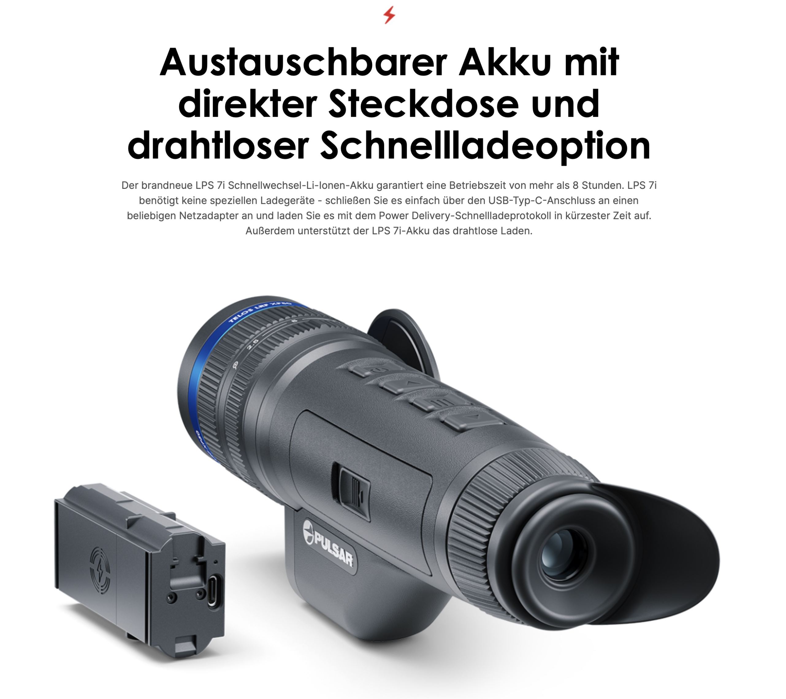 Pulsar 79187 Batterie Pack LPS 7i für Pulsar TelosArtikelnummer: 79187EAN: 4779022925894Diese die Batterie ist ein Zubehörteil für die Telos Reihe von PULSAR.Der brandneue LPS 7i Schnellwechsel-Li-Ionen-Akku garantiert eine Betriebszeit von mehr als 8 Stunden. LPS 7i benötigt keine speziellen Ladegeräte - schließen Sie es einfach über den USB-Typ-C-Anschluss an einen beliebigen Netzadapter an und laden Sie es mit dem Power Delivery-Schnellladeprotokoll in kürzester Zeit auf. Außerdem unterstützt der LPS 7i-Akku das drahtlose Laden.