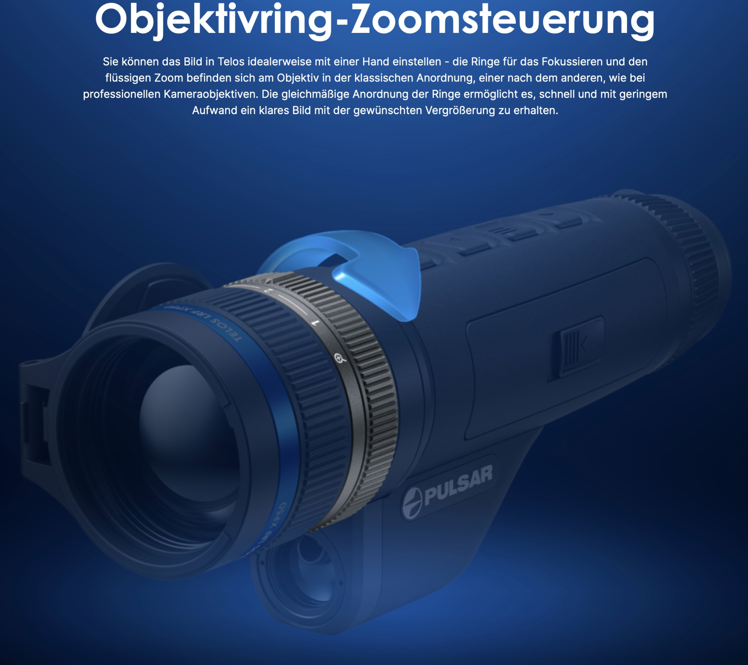 Sie können das Bild im Telos idealerweise mit einer Hand einstellen – die Ringe für das Fokussieren und den flüssigen Zoom befinden sich am Objektiv in der klassischen Anordnung, einer nach dem anderen, wie bei professionellen Kameraobjektiven. Die gleichmäßige Anordnung der Ringe ermöglicht es, schnell und mit geringem Aufwand ein klares Bild mit der gewünschten Vergrößerung zu erhalten.