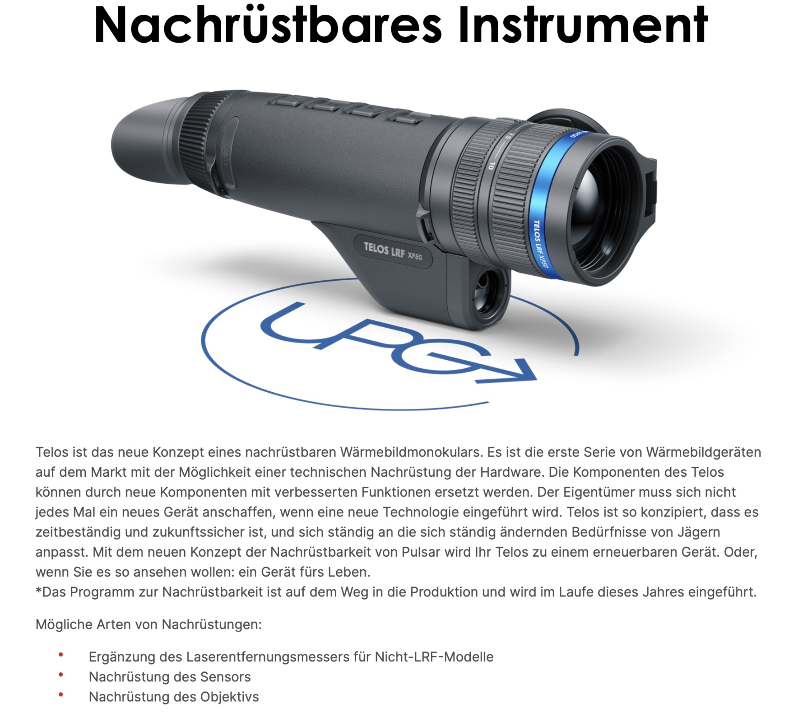 Тelos ist das neue Konzept eines nachrüstbaren Wärmebildmonokulars. Diese Serie von Wärmebildgeräten ist die erste auf dem Markt, die die Möglichkeit zur technischen Nachrüstung der Hardware bietet. Die Komponenten des Telos können durch neue Komponenten mit verbesserten Funktionen ersetzt werden. Der Eigentümer muss sich nicht jedes Mal ein neues Gerät anschaffen, wenn eine andere Technologie eingeführt wird. Telos ist so konzipiert, dass es zeitbeständig und zukunftssicher ist, und sich kontinuierlich an die sich ständig ändernden Bedürfnisse von Jägern anpasst. Mit dem neuen Konzept der Nachrüstbarkeit von Pulsar wird Ihr Telos zu einem erneuerbaren Gerät. Oder, wenn Sie möchten, einem Gerät fürs Leben.