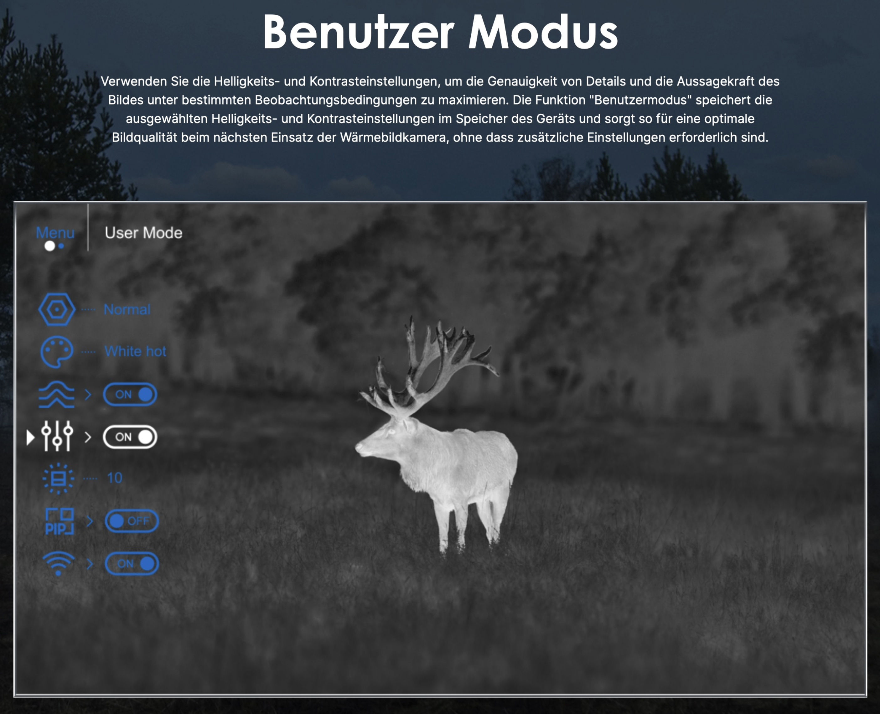 Verwenden Sie die Helligkeits- und Kontrasteinstellungen, um die Detailgenauigkeit und die Aussagekraft des Bildes unter bestimmten Beobachtungsbedingungen zu maximieren. Die Funktion "Benutzermodus" speichert die ausgewählten Helligkeits- und Kontrasteinstellungen auf dem Gerätespeicher und sorgt so für eine optimale Bildqualität beim nächsten Einsatz der Wärmebildkamera, ohne dass zusätzliche Einstellungen erforderlich sind.