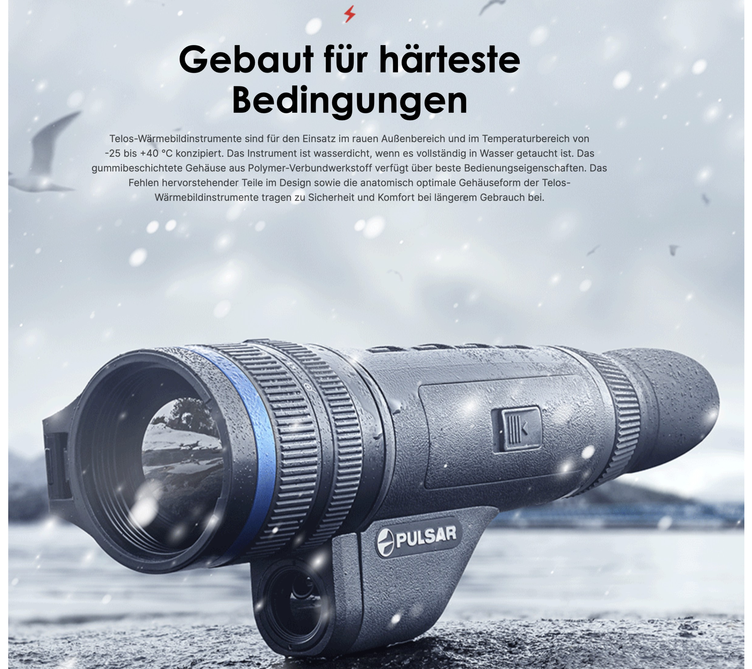 Gehäuse, Akku, Optik und Elektronik des Telos sind auf den Einsatz in einem weiten Temperaturbereich ausgelegt. Das Telos gewährleistet eine zuverlässige und effektive Leistung bei eisiger Kälte bis zu -25 °C.
